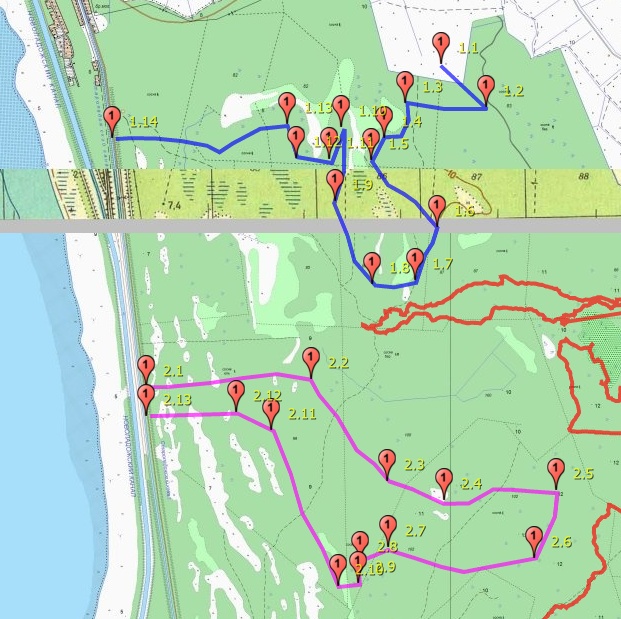3. Осмотр и работа на отклик с юга. На схеме цвет фиолетовый. Маршрут старался проложить с учетом болот. В частности между точками 10 и 11 путь по полосе леса. Точки 4, 5, 6, 7 вокруг болота, надо корректироваться на месте.