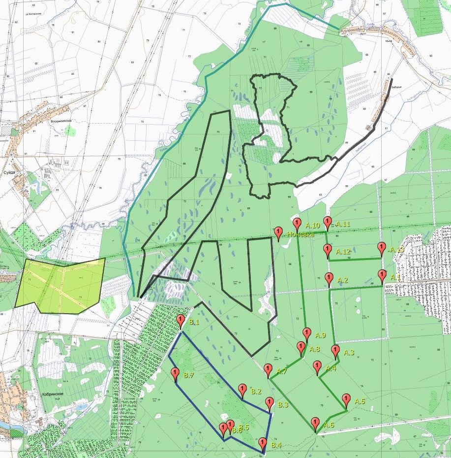 3. Гребенников + Анна Азарова (красный) Заход по дороге на СВ до точки 2, обратно примерно посередине между речкой Суйда и пройденной дорогой. Работа на отклик.