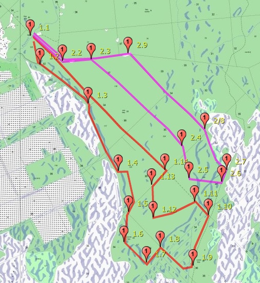 Группа Кузьмина + Савочкина (красная линия) Северный край болота, возможно будет удобно по старым насыпям. Далее южнее, потом восточнее до тропы/дороги. Оценить ее состояние и заметность. Прокрикивание участка на ЮВ, далее по просекам возврат на точку старта.